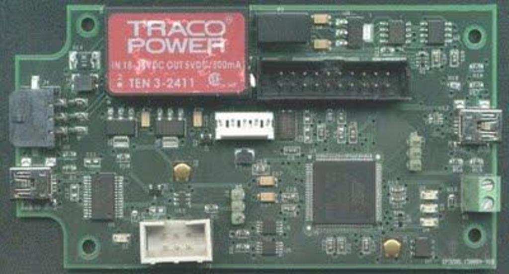 A PCB with an AT91SAM7X128 processor with galvanically isolated CAN bus and power running off 24V DC.