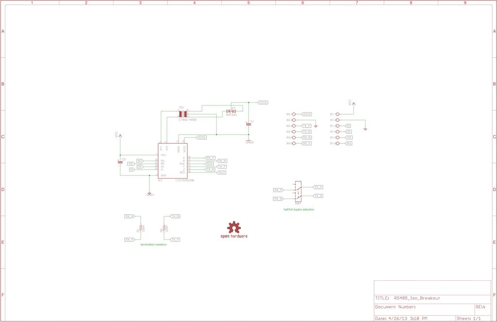Isolated UART to RS-485 Trasceiver Breakout Board Supports Full and Half Duplex operation with a slider switch. Includes 120-ohm termination resistors.